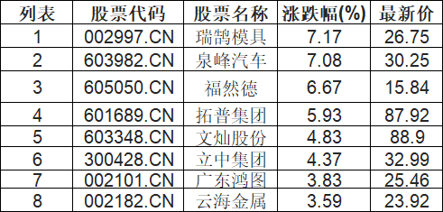 汽车一体化压铸板块拉升,瑞鹄模具(002997.CN)涨7.17%
