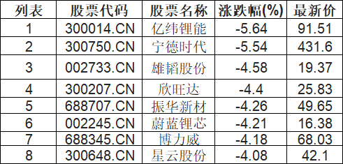电池板块下挫,亿纬锂能(300014.CN)跌5.64%