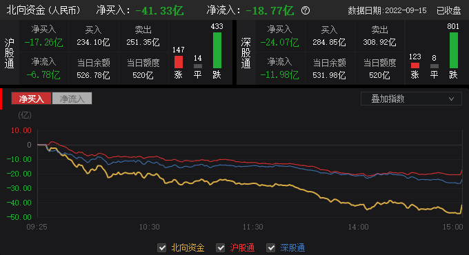 北向资金盘中呈单边净流出态势,全日净卖出41.33亿元,其中,沪股通净卖出17.26亿元,深股通净卖出24.07亿元。