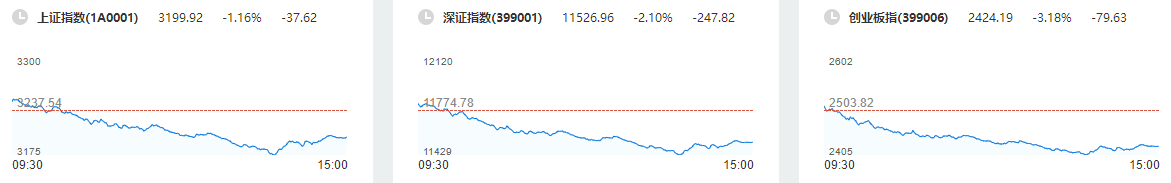 9月15日,两市三大股指盘中单边震荡下探,沪指跌超1%失守3200点,深成指跌超2%,创业板指、科创50指数大跌超3%。截至收盘,沪指跌1.16%报3199.92点,深成指跌2.1%报11526.96点,创业板指跌3.18%报2424.19点;两市合计成交9191亿元。