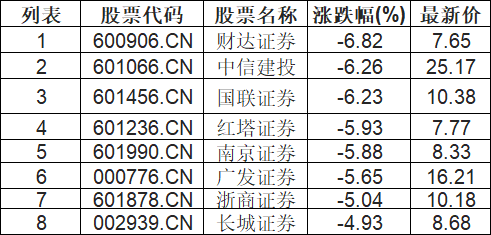 证券板块下挫,财达证券(600906.CN)跌6.82%