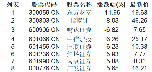 券商概念板块下挫,东方财富(300059.CN)跌11.95%