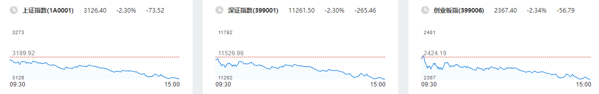 截止收盘,沪指报3126.4点,跌2.3%,成交额为3551亿元;深成指报11261.5点,跌2.3%,成交额为4443亿元;创指报2367.4点,跌2.34%,成交额为1470亿元。