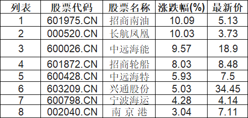截至10:15,航运港口板块拉升。招商南油(601975.CN)涨10.09%报5.13元,长航凤凰(000520.CN)涨10.03%报3.73元,中远海能(600026.CN)涨9.57%报18.9元,招商轮船(601872.CN)涨8.03%报8.48元,中远海特(600428.CN)涨5.93%报7.5元,兴通股份(603209.CN)涨5.03%报34.45元,宁波海运(600798.CN)涨4.28%报4.14元,南 京 港(002040.CN)涨3.04%报7.11元。
