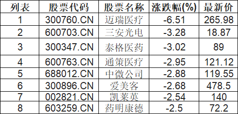 截至10:30,宁组合板块下挫。迈瑞医疗(300760.CN)跌6.51%报265.98元,三安光电(600703.CN)跌3.28%报18.87元,泰格医药(300347.CN)跌3.02%报89.0元,通策医疗(600763.CN)跌2.95%报121.12元,中微公司(688012.CN)跌2.88%报119.55元,爱美客(300896.CN)跌2.68%报478.5元,凯莱英(002821.CN)跌2.54%报140.0元,药明康德(603259.CN)跌2.50%报72.2元。