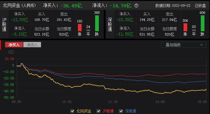 数据显示,北向资金全天净卖出36.49亿元,连续3日净卖出;其中沪股通净卖出12.93亿元,深股通净卖出23.55亿元。