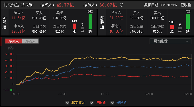 9月26日,数据显示,北向资金全天逆势净买入42.77亿元,终结连续4日净卖出;其中沪股通净买入11.54亿元,深股通净买入31.23亿元。