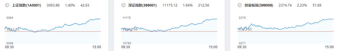 周一晚间,人民银行发文称,目前,金融稳定保障基金基础框架初步建立,已有一定资金积累。周二A股迎来久违大涨,沪指向上逼近3100点关口,创业板指涨幅较大,个股也呈现普涨格局。截至收盘,上证指数涨1.4%,深证成指涨1.94%,创业板指涨2.23%,科创50指数涨1.52%。