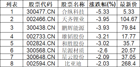刀片电池板块下挫,合纵科技(300477.CN)跌5.33%