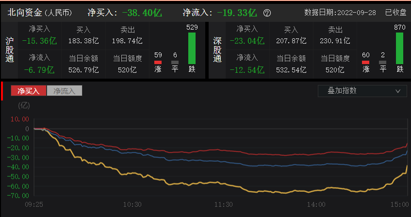 北向资金单全天净卖出38.4亿元;其中沪股通净卖出15.36亿元,深股通净卖出23.04亿元。
