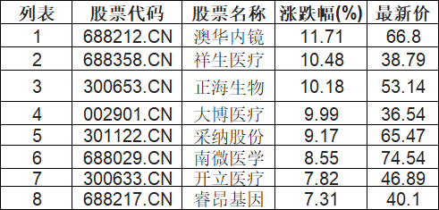 医疗器械板块拉升,澳华内镜(688212.CN)涨11.71%