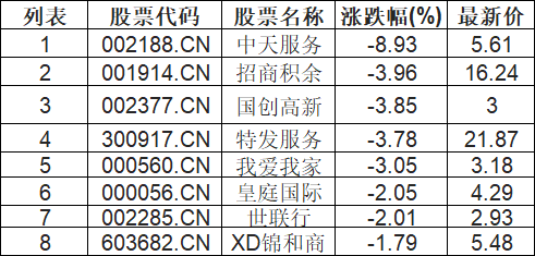 房地产服务板块下挫,中天服务(002188.CN)跌8.93%