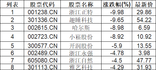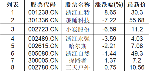 户外露营板块下挫,浙江正特(001238.CN)跌9.98%