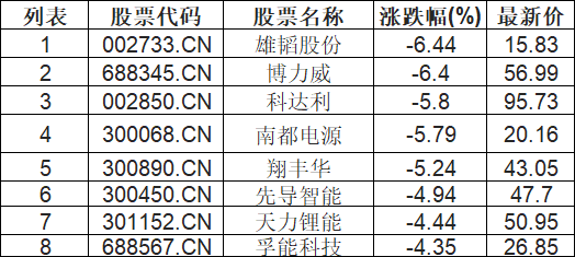 电池板块下挫,雄韬股份(002733.CN)跌6.44%