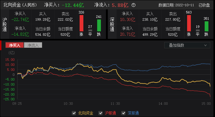 10月11日,北向资金全天净卖出12.44亿元,其中沪股通净卖出22.74亿元,深股通净买入10.3亿元。