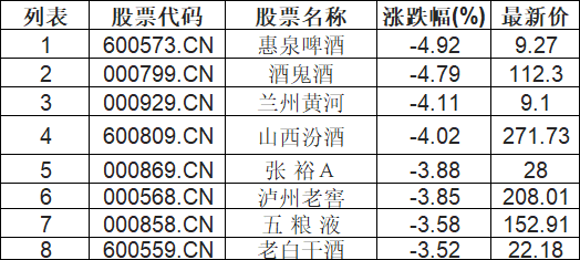 截至10:45,酿酒行业板块下挫。惠泉啤酒(600573.CN)跌4.92%报9.27元,酒鬼酒(000799.CN)跌4.79%报112.3元,兰州黄河(000929.CN)跌4.11%报9.1元,山西汾酒(600809.CN)跌4.02%报271.73元,张 裕A(000869.CN)跌3.88%报28.0元,泸州老窖(000568.CN)跌3.85%报208.01元,五 粮 液(000858.CN)跌3.58%报152.91元,老白干酒(600559.CN)跌3.52%报22.18元。