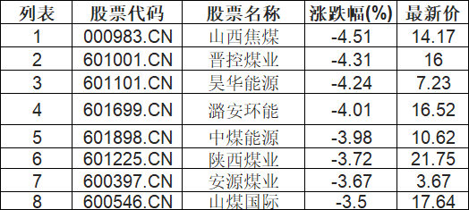 煤炭行业板块下挫,山西焦煤(000983.CN)跌4.51%