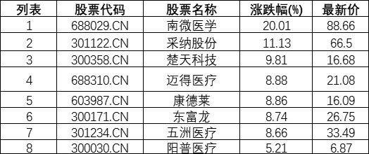 注射器概念板块拉升,南微医学(688029.CN)涨20.01%