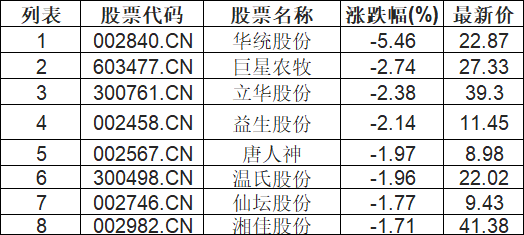 鸡肉概念板块下挫,华统股份(002840.CN)跌5.46%