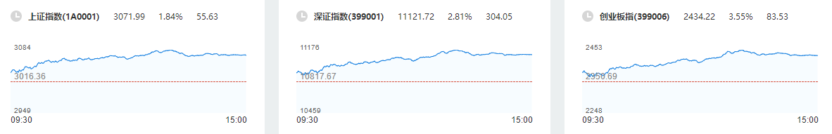 早盘A股三大指数高开高走,沪指盘中涨近2%,深成指涨逾2% ,创业板指一度大涨超3%。医药医疗股掀涨停潮,医疗器械、新冠检测等细分领域集体大涨,恒瑞医药等多股涨停。教育板块大涨,中公教育等涨停。此外券商、信创、新零售、白酒等走势活跃。