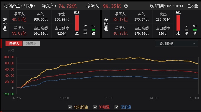 数据显示,10月14日,北向资金全天大幅净买入74.72亿元,结束连续3日净卖出;其中沪股通净买入46.53亿元,深股通净买入28.19亿元。