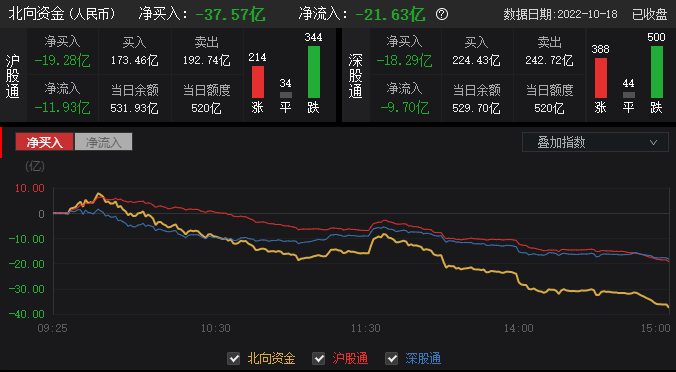 10月18日,数据显示,北向资金全天净卖出37.57亿元;其中沪股通净卖出19.28亿元,深股通净卖出18.29亿元。