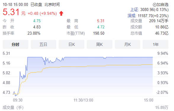 重要资讯:沪深交易所2022年10月18日公布的交易公开信息显示,胜利股份因成为当日涨幅偏离值达7%的证券上榜。胜利股份当日收报5.31元,涨跌幅9.94%,偏离值9.64%,换手率23.88%,成交额10.86亿元。