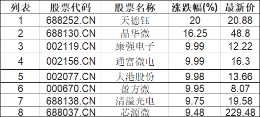 截至10:45,半导体板块拉升。天德钰(688252.CN)涨20.00%报20.88元,晶华微(688130.CN)涨16.25%报48.8元,康强电子(002119.CN)涨9.99%报12.22元,通富微电(002156.CN)涨9.99%报16.3元,大港股份(002077.CN)涨9.98%报13.66元,盈方微(000670.CN)涨9.95%报8.07元,清溢光电(688138.CN)涨9.75%报19.58元,芯源微(688037.CN)涨9.48%报229.48元。