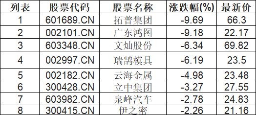汽车一体化压铸板块下挫,拓普集团(601689.CN)跌9.69%
