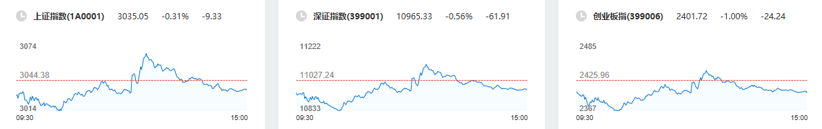 截至收盘,上证指数报3035.05点,跌幅0.31%,成交额3400.91亿元;深证成指报10965.33点,跌幅0.56%,成交额4561.51亿元;创业板指报2401.72点,跌幅1.00%,成交额1583.59亿元。