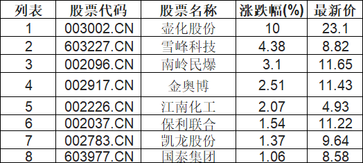 民爆概念板块拉升,壶化股份(003002.CN)涨10.0%