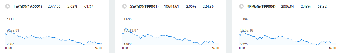 早盘指数后小幅冲高,深成指一度涨超1%,随后再度回落走低,三大指数盘中均跌超1%,上证50一度跌近3%。白酒板块大幅下挫,贵州茅台跌6%。军工板块逆市大涨,中航重机等涨停。半导体、光刻胶概念继续活跃,大港股份3连板,彤程新材涨停。此外工业母机、信创、汽车零部件、油气等板块走强,旅游、教育、房地产等板块走弱。午后指数再次下挫,三大指数集体跌逾2%,沪指失守3000点关口。医药股持续走弱,片仔癀等多股跌停。白酒股持续走弱,贵州茅台一度跌逾8%跌破1500元关口。猪肉股震荡走弱,华统股份跌停。整体看,个股跌多涨少,两市超3800股下跌。贵州茅台收跌7.56%。
