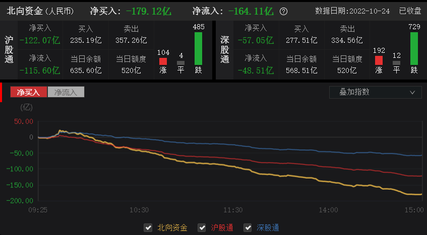 10月24日,北向资金全天单边净卖出179.12亿元,单日净卖出额创历史新高。北向资金成交金额1204.52亿元,占A股总成交额13.67%,交易活跃度上升35.86%,其中沪股通买入金额235.19亿元,卖出金额357.26亿元,深股通买入金额277.51亿元,卖出金额334.56亿元。北向资金保持连续6日净卖出,合计净卖出472.40亿元。