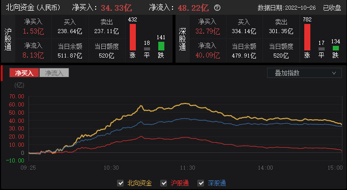 10月26日,北向资金全天净买入34.32亿元,连续两日加仓;其中沪股通净买入1.53亿元,深股通净买入32.79亿元。北向资金成交金额1111.23亿元,占A股总成交额12.21%,交易活跃度下降1.26%,其中沪股通买入金额238.64亿元,卖出金额237.11亿元,深股通买入金额334.14亿元,卖出金额301.35亿元。