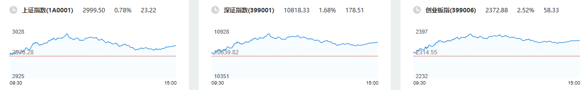 10月26日,两市股指早盘高开高走,创业板指一度涨逾3%,随后震荡回落。各板块呈普涨格局,医药、信创、半导体等涨幅居前。截至收盘,沪指涨0.78%,深证成指涨1.68%,创业板指涨2.52%。信创概念大涨,中国软件等逾10只个股涨停;CXO概念、医药、医疗保健、半导体等板块均大涨;银行、煤炭等极少数板块下跌。两市约4000只个股上涨。逾百只个股涨幅达到或超过10%。