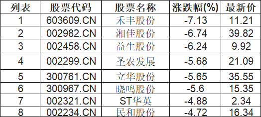 鸡肉概念板块下挫,禾丰股份(603609.CN)跌7.13%