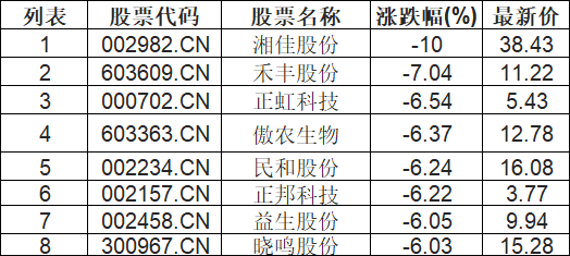 农牧饲渔板块下挫,湘佳股份(002982.CN)跌10.0%