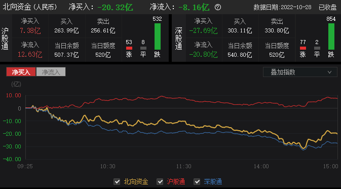 10月28日消息,北向资金全天净卖出20.32亿元,此前连续3日净买入,本周累计减仓127亿元。今日沪股通净买入7.38亿元,深股通净卖出27.69亿元。