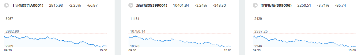 10月28日,A股三大指数低开,早盘沪指横盘,深成指、创业板指震荡下挫,午后A股继续走弱,沪指跌超2%退守2900点刷新调整新低,创业板指跌近4%。截至收盘,沪指跌2.25%,报2915.93点,深成指跌3.24%,报10401.84点,创业板指跌3.71%,报2250.51点。沪深两市合计成交额9096.59亿元,北向资金实际净卖出20.32亿元。