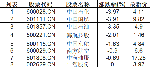 截至11:15,油价相关板块下挫。中国石化(600028.CN)跌3.97%报4.11元,中国国航(601111.CN)跌3.91%报9.82元,中国石油(601857.CN)跌3.35%报4.9元,海航控股(600221.CN)跌2.01%报1.46元,中国东航(600115.CN)跌1.63%报4.84元,南方航空(600029.CN)跌0.90%报6.6元,中海油服(601808.CN)跌0.69%报17.28元,仁智股份(002629.CN)0.00%报3.92元。