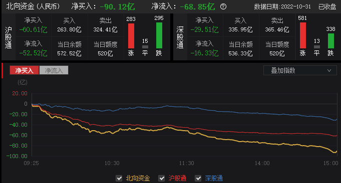 北向资金盘中单边大幅净流出,全日净卖出90.12亿元;10月累计净卖出达573亿元,单月净卖出额创2020年3月以来新高。