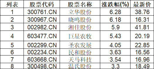 鸡肉概念板块拉升,立华股份(300761.CN)涨6.28%