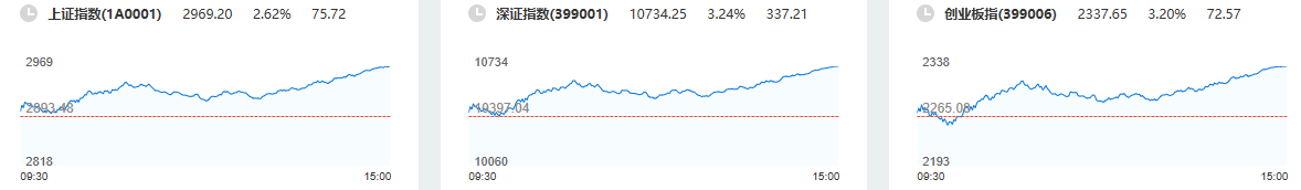 1日,A股三大股指震荡上行,沪指重回2900点上方,创业板指重上2300点。截至收盘,沪指涨2.62%报2969.20点;深成指涨3.24%报10734.25点;创业板指涨3.20%报2337.65点。