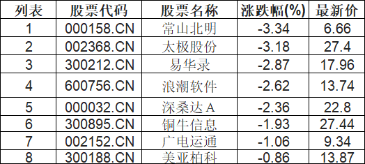 国资云概念板块下挫,常山北明(000158.CN)跌3.34%