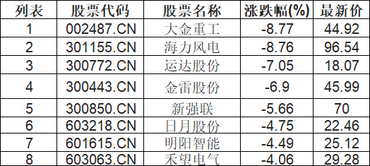 风电设备板块下挫,大金重工(002487.CN)跌8.77%