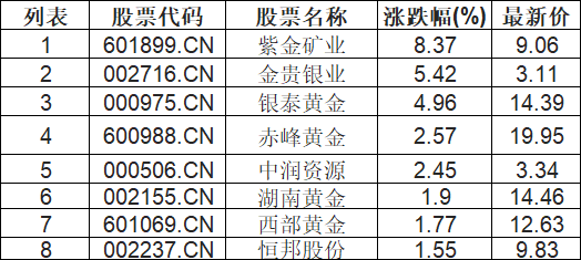 贵金属板块高开,紫金矿业(601899.CN)涨8.37%
