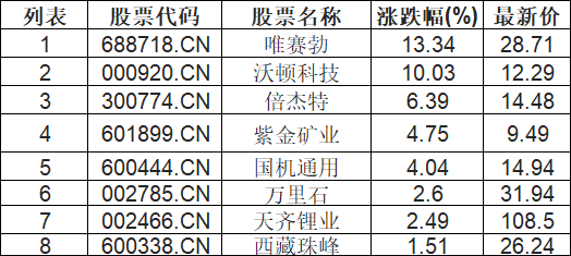 截至09:30,盐湖提锂板块高开。唯赛勃(688718.CN)涨13.34%报28.71元,沃顿科技(000920.CN)涨10.03%报12.29元,倍杰特(300774.CN)涨6.39%报14.48元,紫金矿业(601899.CN)涨4.75%报9.49元,国机通用(600444.CN)涨4.04%报14.94元,万里石(002785.CN)涨2.60%报31.94元,天齐锂业(002466.CN)涨2.49%报108.5元,西藏珠峰(600338.CN)涨1.51%报26.24元。