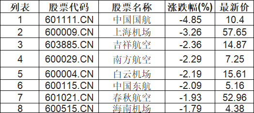 航空机场板块下挫,中国国航(601111.CN)跌4.85%