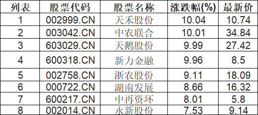 供销社概念板块拉升,天禾股份(002999.CN)涨10.04%