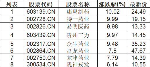 中药板块拉升,康惠制药(603139.CN)涨10.02%